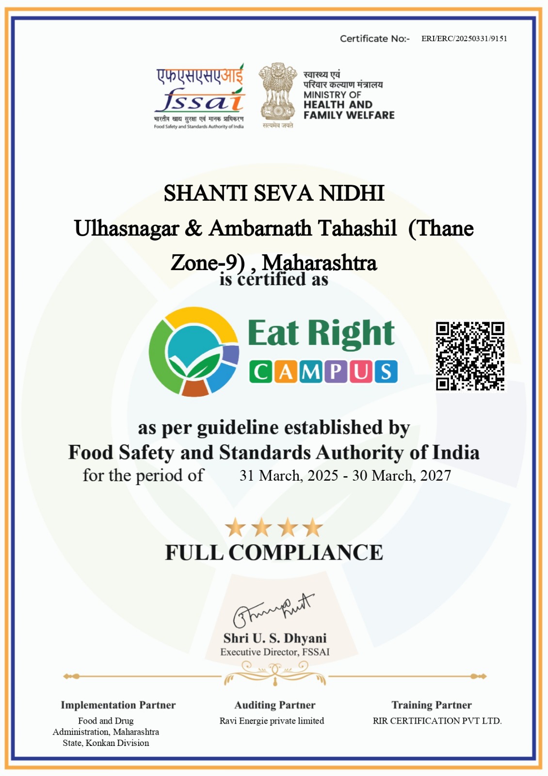 The NTTF Murbad Training Centre (MNTC) Canteen , managed by Shanti Seva Nidhi, has been honored with the prestigious "Eat Right Campus" Certificate by the Ministry of Health & Family Welfare, Government of India.