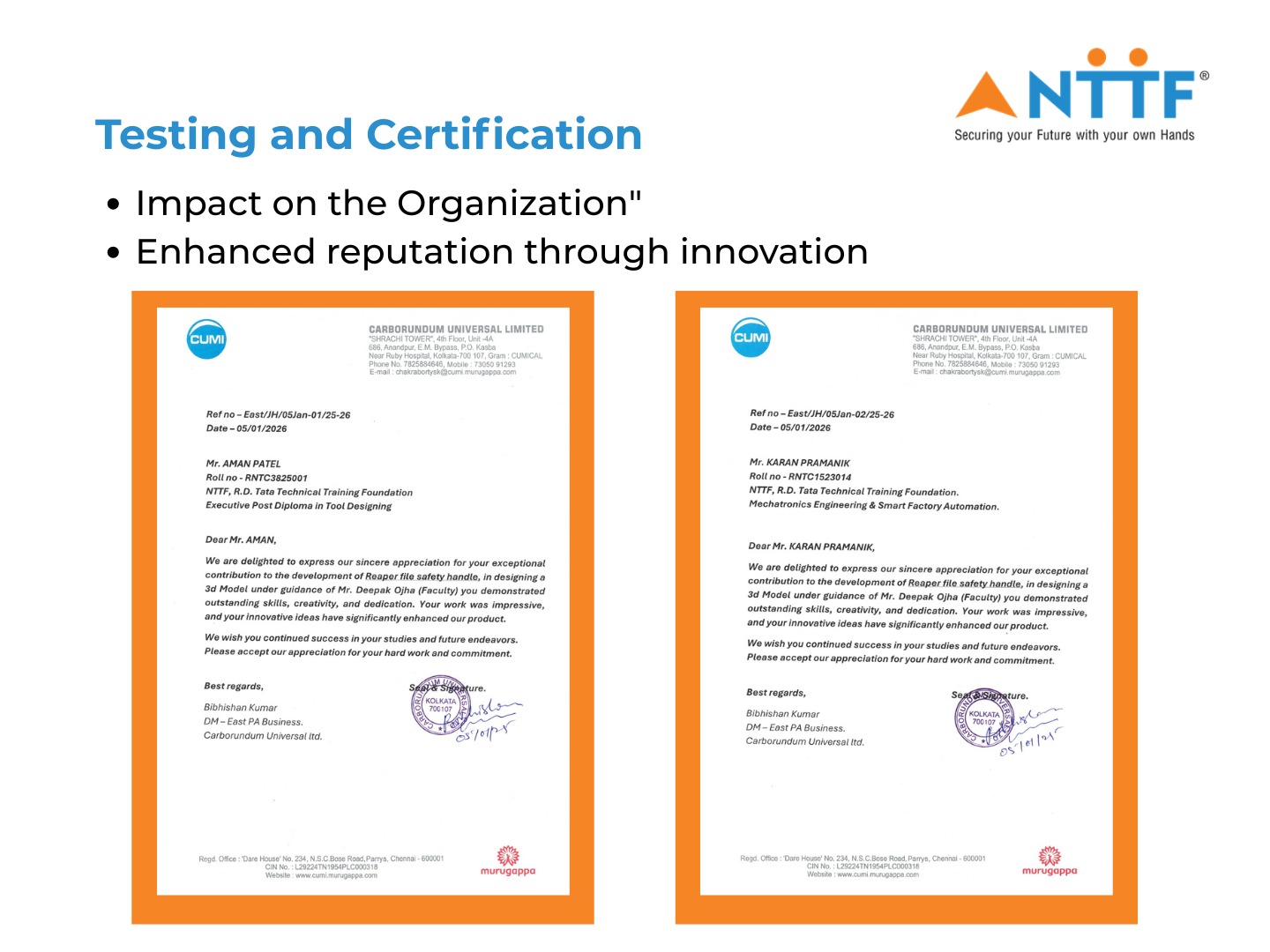 We are pleased to share that Mr. Aman Patel (CP38) and Mr. Karan Pramanik (CP15) from NTTF Murbad Training Centre (MNTC) have received appreciation from Carborundum Universal Limited (CUMI) for their innovative safety solution design developed for a Reaper file used in a surface grinding machine.